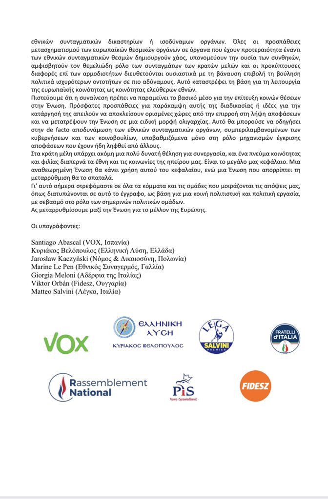 Στην δήλωση τους τονίζουν πως «Η Ευρωπαϊκή Ένωση χρειάζεται μία βαθιά μεταρρύθμιση, διότι σήμερα αντί να προστατεύει την Ευρώπη και την κληρονομιά της, αντί να επιτρέπει την ελεύθερη ανάπτυξη των ευρωπαϊκών εθνών, καθίσταται η ίδια πηγή προβλημάτων, άγχους και αβεβαιότητας.