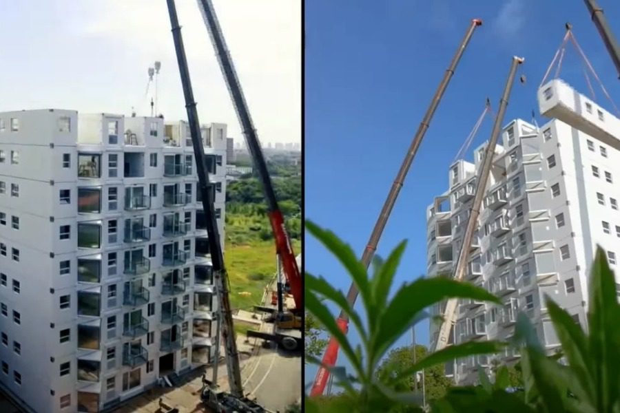 Σε μια σκηνή που θυμίζει Jenga, χρησιμοποιήθηκαν γερανοί για να ανυψώσουν τις μονάδες και να τις στοιβάξουν τη μία πάνω από την άλλη, με τους εργάτες να εργάζονται γρήγορα για να τα βιδώσουν όλα στη θέση τους.