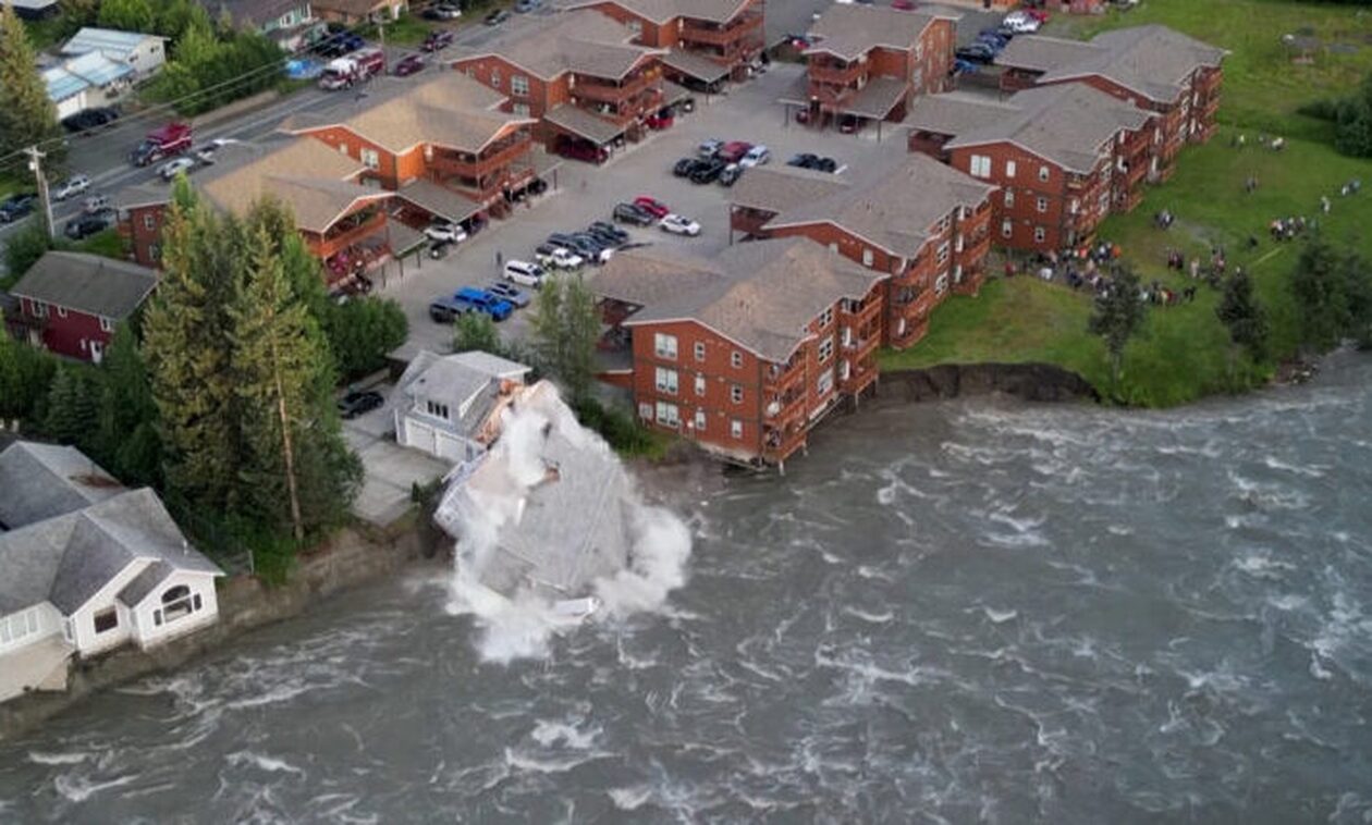 Πλάνα από drone κατέγραψαν τη στιγμή που ένα σπίτι κατέρρευσε στον ποταμό Mendenhall στο Τζούνο της Αλάσκας, μετά από παγετώδεις πλημμύρες.