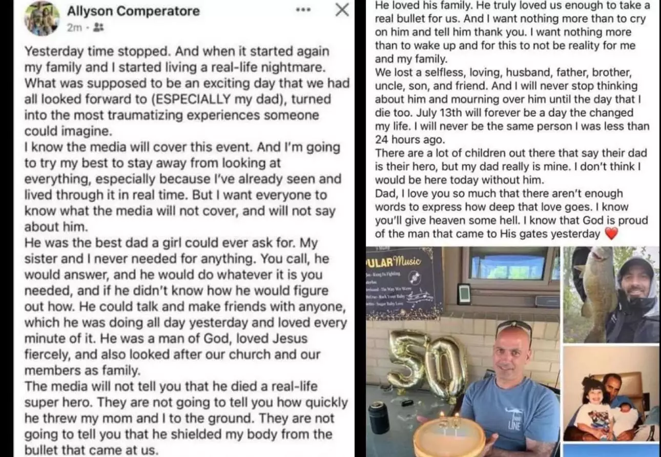 «Η προεκλογική συγκέντρωση του Ντόναλντ Τραμπ στην Πενσιλβάνια στοίχισε τη ζωή του αδελφού μου, του Κόρεϊ Κομπερατόρε. Το μίσος για τον Ν.Τραμπ στοίχισε τη ζωή του ανθρώπου που αγαπούσαμε περισσότερο» ανέφερε η αδελφή του στην ανάρτησή της ώρες μετά την απόπειρα δολοφονίας.