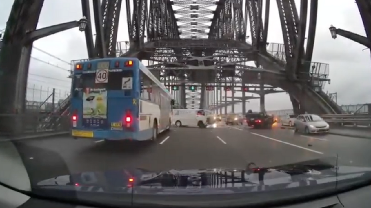 If you were late to work this morning because of the accident on the Sydney Harbour Bridge, here's dashcam footage showing the reckless driving that resulted in a head-on collision. Incredibly, no-one died.https://t.co/gGQ6eiXN5l pic.twitter.com/FYB2mFXwJY