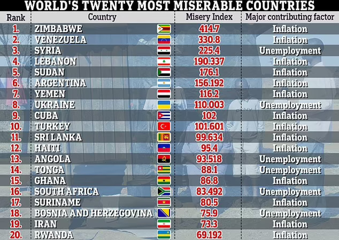 Διαβάζοντας κανείς τον κατάλογο που δημοσίευσε για ακόμη μια χρονιά ο καθηγητής του πανεπιστημίου Johns Hopkins, Στιβ Χάνκε, γίνεται αντιληπτό ότι τόσο η ανέχεια και ο πληθωρισμός όσο και οι εμπόλεμες συνθήκες κρίνονται καθοριστικές για την τοποθέτησε των κρατών στη συγκεκριμένη κατηγορία.