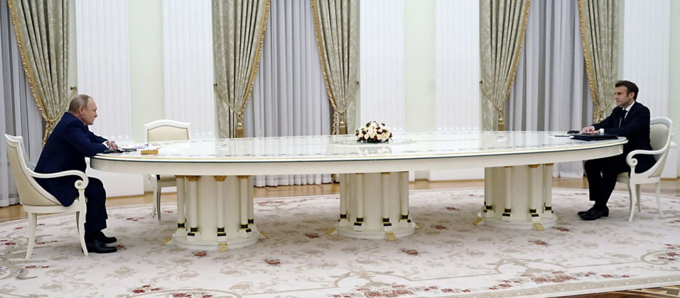 Κατά τη διάρκεια των συνομιλιών τους, ο Γάλλος ηγέτης ήταν μόνος του με τον Πούτιν, χωρίς βοηθούς και μόνο έναν διερμηνέα.