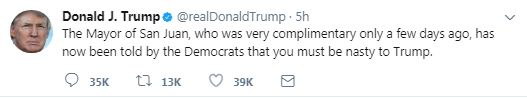 Ο ίδιος, έγραψε στο Twitter, ότι οι κάτοικοι «θέλουν να γίνουν όλα γι’ αυτούς. Η δήμαρχος του Σαν Χουάν που πριν από μερικές ήταν επαινετική, τώρα ακολούθησε την συμβουλή των Δημοκρατικών ότι θα πρέπει να είναι μοχθηρή με τον Τραμπ», τόνισε ο Τραμπ σε ανάρτησή του στο Twitter, από το ιδιόκτητο θέρετρο του γκολφ που διαθέτει στο Μπεντμίνστερ του Νιου Τζέρσεϊ, όπου βρίσκεται για το Σαββατοκύριακο.