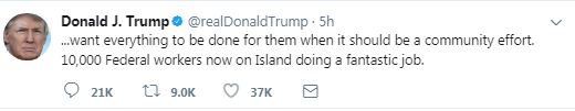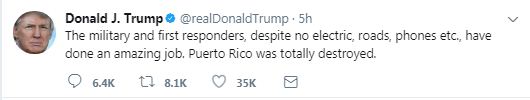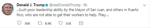 Σε μια σειρά πρωινών αναρτήσεων του στο Twitter, ο Τραμπ εμφανίστηκε να καταλογίζει ευθύνες και σε μερικούς από τους κατοίκους του Πουέρτο Ρίκο, σχετικά με την αργοπορία στην διάθεση ανθρωπιστικής βοήθειας για την αντιμετώπιση των καταστροφών, που προκάλεσε ο κυκλώνας Μαρία.