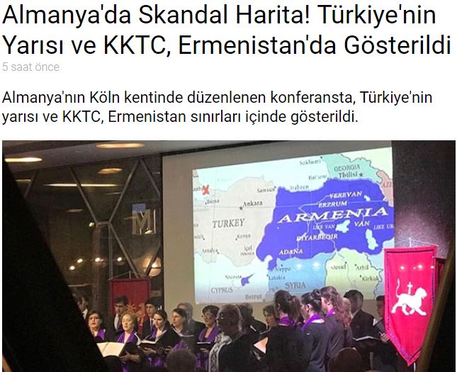 Συγκεκριμένα σε εκδήλωση που διοργάνωσε ο Επίσκοπος των Αρμενίων της Γερμανίας, στην Κολωνία, προβλήθηκε χάρτης της Αρμενίας, όπου δείχνει τη μισή Τουρκία και την κατεχόμενη Κύπρο να ανήκει στην Αρμενία.