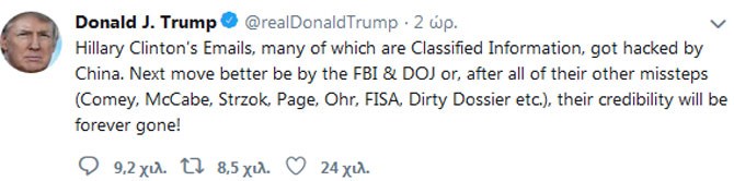 «Τα emails της Χίλαρι Κλίντον, πολλά από τα οποία είναι Απόρρητες Πληροφορίες, χακαρίστηκαν από την Κίνα. Η επόμενη κίνηση καλύτερα να είναι από FBI & DOJ [υπουργείο Δικαιοσύνης] αλλιώς, έπειτα από όλες τις άλλες γκάφες τους (Κόμεϊ, ΜακΚέιμπ, Στρζοκ, Πέιτζ, Oρ, FISA, Βρώμικος φάκελος κ.λπ.), η αξιοπιστία τους θα έχει χαθεί για πάντα» έγραψε ο Τραμπ στο Twitter λίγο μετά τα μεσάνυχτα (ώρα ΗΠΑ).