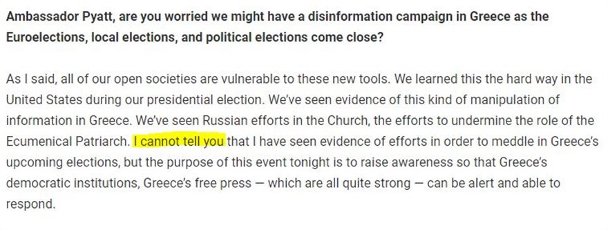 Εκεί ο σταθμός, από λάθος όπως διευκρινίστηκε, μετέφρασε τα λόγια του κυρίου Πάιατ ως «μπορώ τώρα να σας πω» (I can now tell you) ενώ ο αμερικανός πρεσβευτής λέει «δεν μπορώ να σας πω» (I can not tell you) «ότι έχω δει αποδείξεις προσπαθειών ανάμειξης στις επερχόμενες εκλογές της Ελλάδος».