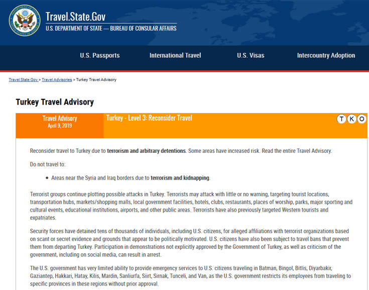 Το αμερικανικό ΥΠΕΞ συμπεριέλαβε την Τουρκία στη λίστα με τις χώρες όπου οι Αμερικανοί πολίτες θα μπορούσαν να τύχουν απαγωγής ή να ληφθούν όμηροι και τους ζητάει να μην την επισκέπτονται.