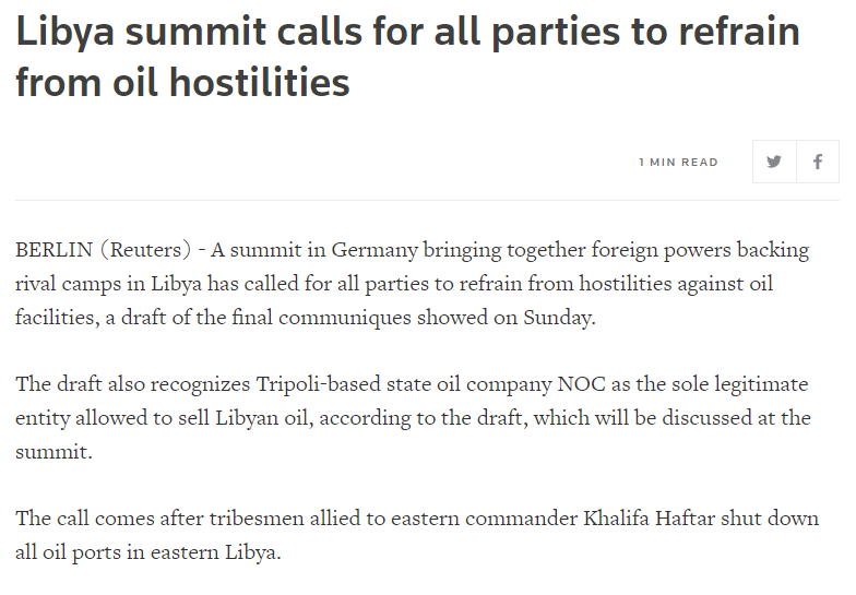 Κάλεσμα σε όλες τις δυνάμεις να απέχουν να απέχουν από εχθροπραξίες κατά πετρελαϊκών εγκαταστάσεων απευθύνει η Διάσκεψη του Βερολίνου για τη Λιβύη, η οποία αναμένεται να ξεκινήσει το μεσημέρι της Κυριακής όμως στην πραγματικότητα μπορούμε να πούμε ότι στρίμωξαν τον Χ.Χαφτάρ καθώς δίνουν το πετρέλαιο στα χέρια του Σάρατζ ενώ ζητάνε αφοπλισμό από βαρέα όπλα και μαχητικά που ουσιαστικά απευθύνεται στον Στρατάρχη Χ.Χαφτάρ που έχει στην κατοχή του τέτοια οπλικά συστήματα και βρίσκονταν στην φάση της προώθησης εναντίον της Τρίπολης.