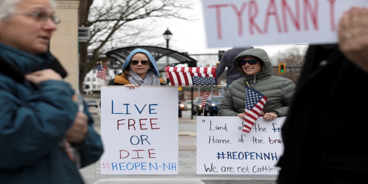 «Οι αριθμοί ψεύδονται» ή «Ξανανοίξτε το Νιου Χαμσάιρ», ήταν τα συνθήματα που αναγράφονταν σε πλακάτ τα οποία κρατούσαν οι διαδηλωτές, οι οποίοι αξιώνουν η πολιτεία των 1,3 εκατομμυρίων κατοίκων να τερματίσει την καραντίνα, νωρίτερα από την προβλεπόμενη ημερομηνία της 4ης Μαϊου.