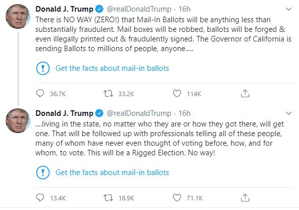 Συγκεκριμένα, η διεύθυνση του ιστότοπου κοινωνικής δικτύωσης Twitter τοποθέτησε μια ειδοποίηση που καλεί τους χρήστες να «ενημερωθούν για τα γεγονότα» σε μια ανάρτηση του Ρεπουμπλικάνου προέδρου Ντόναλντ Τραμπ σχετικά με τις επιστολικές ψήφους, στην οποία ο ένοικος του Λευκού Οίκου διατείνεται πως οι ψήφοι αυτές είναι «ουσιαστικά χαλκευμένες» και θα έχουν ως αποτέλεσμα την «εκλογική νοθεία».