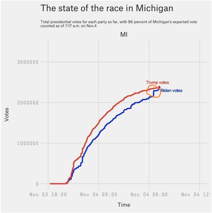 Συγκεκριμένα στο Μίσιγκαν μία πολιτεία που ο Ντόναλντ Τραμπ προηγούνταν με 10 μονάδες κατά τη διάρκεια της… βραδινής καταμέτρησης εμφανίστηκαν 140.000 συνεχόμενοι ψήφοι του Μπάιντεν έναντι 0 του Τραμπ!