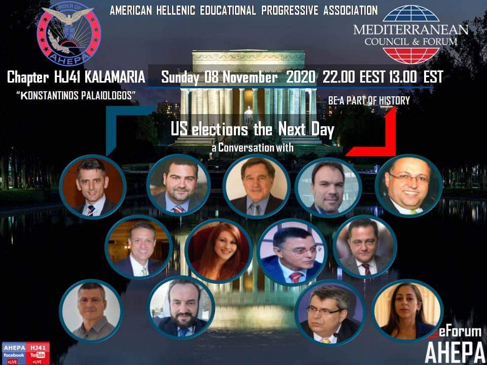 Διαδικτυακό «στρογγυλό τραπέζι» από το Mediterranean Council & Forum MEDCF (medcf.org), με το Pronews TV και την επικοινωνιακή χορηγία του pronews.gr, διοργανώνει η Αmerican Hellenic Educational Progressive Association- AHEPA HJ41 με την υποστήριξη του “Israel Institute of Strategic Studies”, σήμερα Κυριακή 08 Nοεμβρίου (20.00 EEST 13.00 EST) και με θέμα «Αμερικανικές Εκλογές, η Επόμενη Ημέρα – US Election the Next Day».