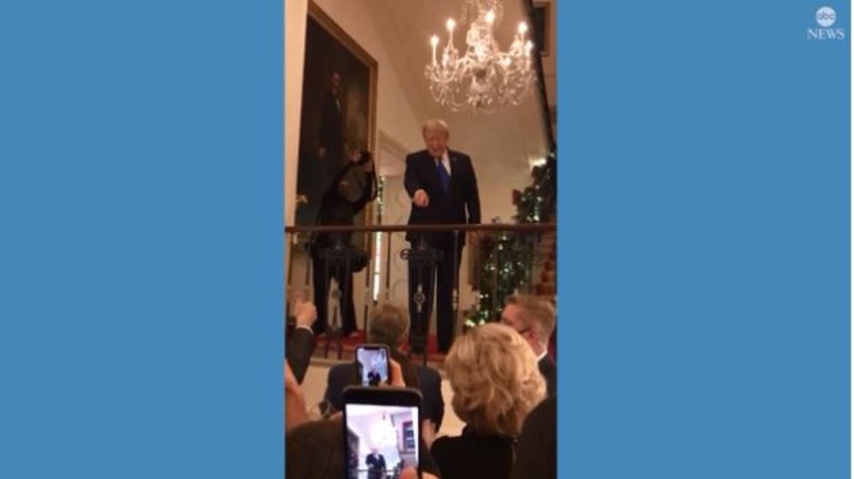 Χριστουγεννιάτικο πάρτι (πιο πολύ με συγκέντρωση ήταν) τηρουμένων των αναλογιών λόγω κορωνοϊού για τον Ν.Τραμπ και την Μ.Τραμπ με δημοσιογράφους βέβαια για ακόμα μια φορά να επιτίθονται στον Αμερικανό πρόεδρο.