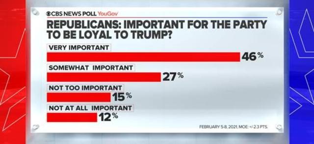 Η δημοσκόπηση διενεργήθηκε από τη γνωστή λονδρέζικη εταιρεία ερευνών YouGov, σε δείγμα 2.508 ενηλίκων κατοίκων των Ηνωμένων Πολιτειών. 46% των ερωτηθέντων που αυτοπροσδιορίστηκαν ως Ρεπουμπλικανοί, δήλωσαν ότι είναι πολύ σημαντικό το κόμμα να μείνει πιστό στον Ντόναλντ Τραμπ, ενώ το 27% θεώρησε κάτι τέτοιο μάλλον σημαντικό. Μόνο το 15% κρίνει κάτι τέτοιο δεν έχει τόσο μεγάλη σημασία, ενώ το 12% το θεωρεί ασήμαντο.