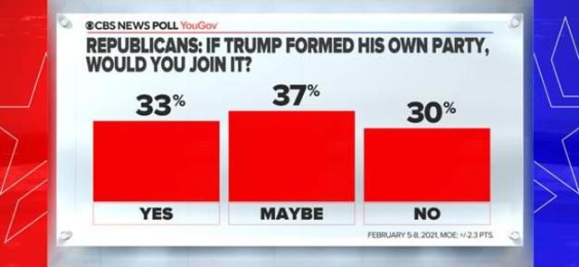 Περισσότεροι από τα δύο τρίτα των Ρεπουμπλικανών θα υποστήριζαν ένα νέο κόμμα ή τουλάχιστον θα το σκεφτόντουσαν, αν ο Ντόναλντ Τραμπ ήταν ο ιδρυτής αυτού του νέου κόμματος. Αυτό προκύπτει από σφυγμομέτρηση του αμερικανικού τηλεοπτικού δικτύου CBS.