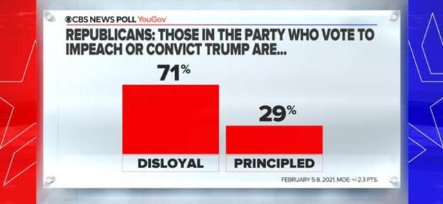 Ενδιαφέρον παρουσιάζει και το γεγονός ότι το 71% των υποστηρικτών του κόμματος χαρακτηρίζει όσους Ρεπουμπλικανούς γερουσιαστές ψηφίσουν υπέρ της εκ των υστέρων καθαίρεσης του Ντόναλντ Τραμπ από το προεδρικό αξίωμα «άπιστους» προς τους ψηφοφόρους τους.