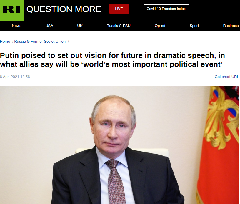 «Αυτό θα είναι ένα μήνυμα για μια νέα εποχή. Στο τρέχον δύσκολο περιβάλλον που αντιμετωπίζει ο κόσμος, το οποίο φέρνει πολλά εμπόδια για χώρες συμπεριλαμβανομένης της Ρωσίας, το διάγγελμα (του Πούτιν) θα είναι το πιο σημαντικό πολιτικό και δημόσιο γεγονός», σημείωσε, ενώ όπως μεταδίδει το RT, σύμφωνα με τους συμμάχους του Ρώσου Προέδρου, θα είναι το «πιο σημαντικό παγκόσμιο πολιτικό γεγονός».