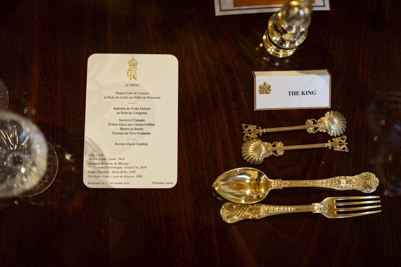 Το μενού ήταν γραμμένο στα γαλλικά, σύμφωνα με την παράδοση των βασιλικών δείπνων, και συνοδευόταν από επιλεγμένα βρετανικά κρασιά.