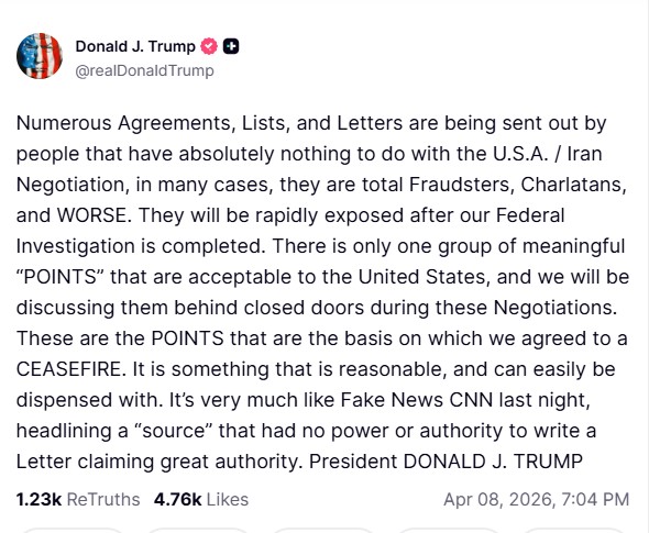 Με ανάρτησή του στην πλατφόρμα Truth Social, ο πρόεδρος των ΗΠΑ, Ντόναλντ Τραμπ, εξέφρασε την οργή του με τα όσα γράφουν ορισμένα αμερικανικά ΜΜΕ και αναμεταδίδονται με ταχεία κυκλοφορία στα μέσα κοινωνικής δικτύωσης, σχετικά με την συμφωνία κατάπαυσης πυρός με το Ιράν.