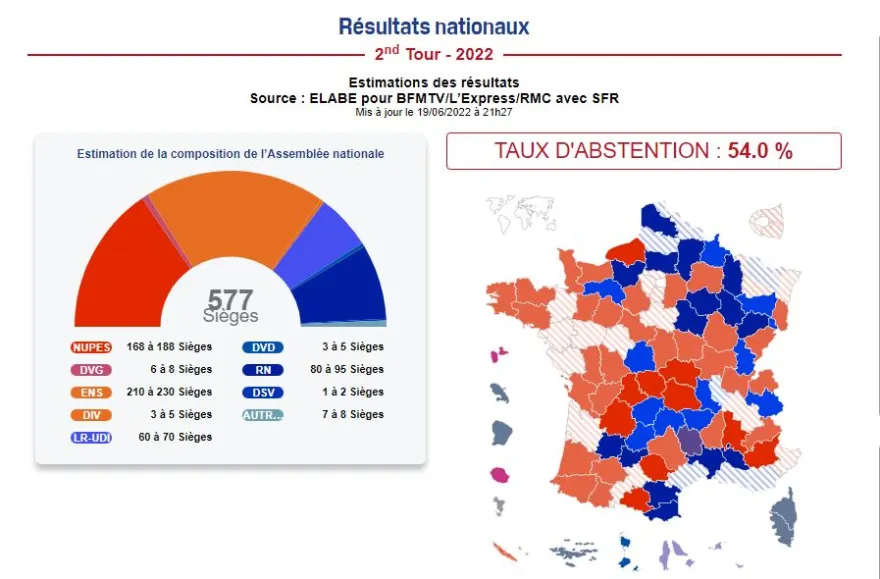 Σύμφωνα με νεότερες εκτιμήσεις του τηλεοπτικού σταθμού BFM η προσκειμένη στον πρόεδρο Μακρόν παράταξη θα λάβει από 210 ως 230 έδρες, ενώ αρκετά μεγαλύτερος φαίνεται να είναι, σε σχέση με προηγούμενες εκτιμήσεις, ο αριθμός των εδρών της αριστερής συμμαχίας του Ζαν-Λυκ Μελανσόν που θα κινηθεί ανάμεσα στις 170 και τις 190 έδρες.