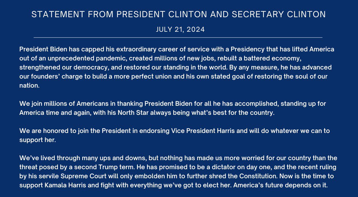 Οι Κλίντον τόνισαν την ισχυρή υποστήριξή τους προς τη Χάρις, λέγοντας: «Είναι τιμή μας που μαζί με τον  πρόεδρο υποστηρίζουμε την αντιπρόεδρο Χάρις και θα κάνουμε ό,τι μπορούμε για να τη στηρίξουμε».