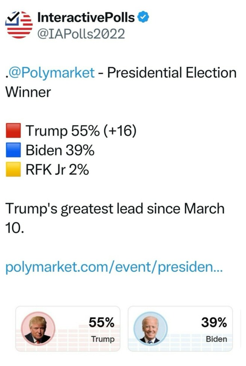 Αξίζει να σημειωθεί ότι η αμερικανική εταιρεία προβλέψεων Polymarket, σε πρόσφατη μέτρηση της δίνει προβάδισμα στον N.Tραμπ έναντι του Τζο Μπάιντεν της τάξεως των 16 μονάδων!