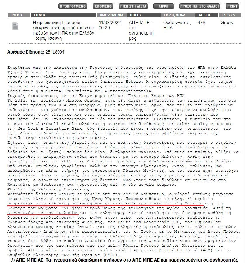 Συγκεκριμένα το Αθηναϊκό Πρακτορείο Ειδήσεων, σε τηλεγράφημά του, μας… ενημερώνει για το βιογραφικό του που προφανώς στα πιο αξιοσημείωτα είναι ότι… έκανε παρέλαση για την 25η Μαρτίου στη Νέα Υόρκη και ότι είχε στενή σχέση με την Εκκλησία.