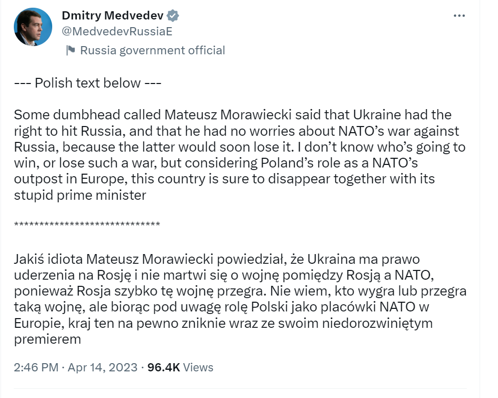 «Κάποιος χαζός που ονομάζεται Mateusz Morawiecki είπε ότι η Ουκρανία είχε το δικαίωμα να χτυπήσει τη Ρωσία και ότι δεν ανησυχούσε για τον πόλεμο του ΝΑΤΟ εναντίον της Ρωσίας, επειδή η τελευταία θα τον έχανε σύντομα.