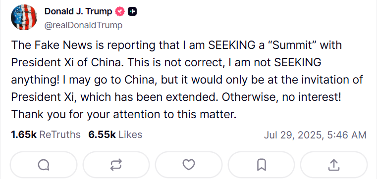 Ο πρόεδρος των ΗΠΑ Ντόναλντ Τραμπ, με ανάρτησή του στο Truth Social δήλωσε ότι δεν αναζητά την ευκαιρία να πραγματοποιήσει το συντομότερο δυνατό συνάντηση με τον Κινέζο ομόλογό του Σι Τζινπίνγκ.