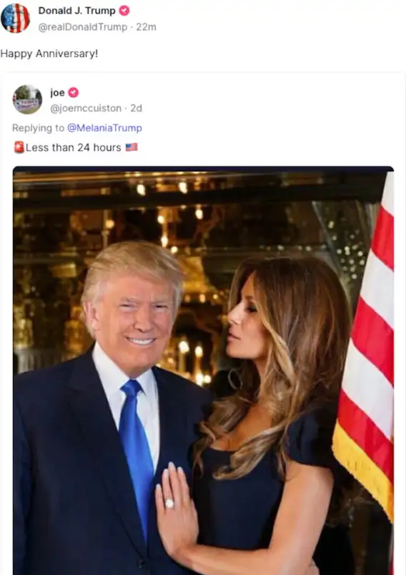 «Ευτυχισμένη επέτειο!» έγραψε ο Τραμπ στην ανάρτηση, η οποία συνοδευόταν από μια φωτογραφία του, να χαμογελά στο φακό, έχοντας το χέρι του γύρω από τη μέση της πρώτης κυρίας.