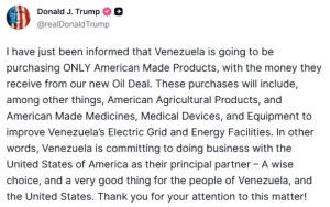 Ο Ντόναλντ Τραμπ ανακοίνωσε ότι η Βενεζουέλα δεν θα αγοράσει παρά μόνο προϊόντα κατασκευασμένα στις ΗΠΑ με τα έσοδα από την πώληση μεγάλης ποσότητας του πετρελαίου της στην οποία θα προχωρήσει η αμερικανική κυβέρνηση, στο πλαίσιο συμφωνίας την οποία επέβαλε η Ουάσιγκτον στο Καράκας.