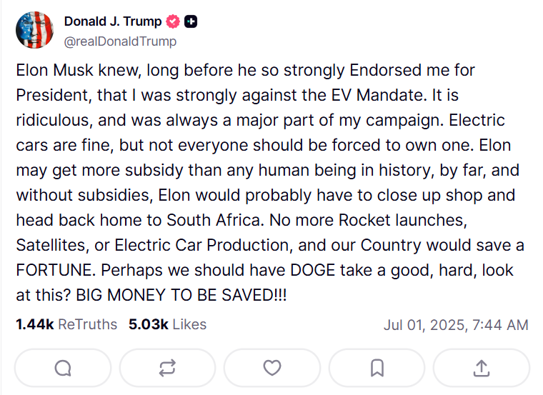 Ο Ντόναλντ Τραμπ με μια ανάρτησή του στο Truth Social, αναφέρθηκε στον Έλον Μασκ, διευκρινίζοντας ότι ήξερε πολύ πριν τον στηρίξει για ορόεδρο, ότι ήταν αντίθετος με την υποχρεωτική επιβολή των ηλεκτρικών αυτοκινήτων.