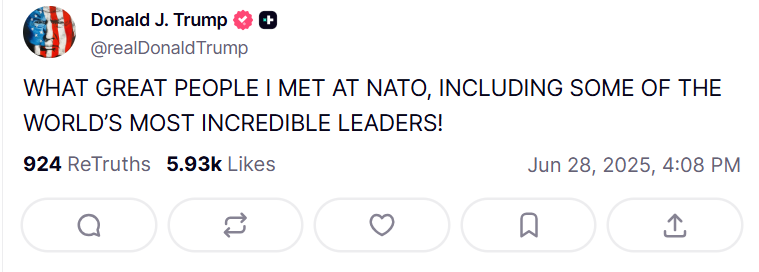 «Τι σπουδαίους ανθρώπους συνάντησα στο ΝΑΤΟ, συμπεριλαμβανομένων μερικών από τους πιο απίστευτους ηγέτες του κόσμου!», είπε ο Αμερικάνος πρόεδρος στο Truth Social.
