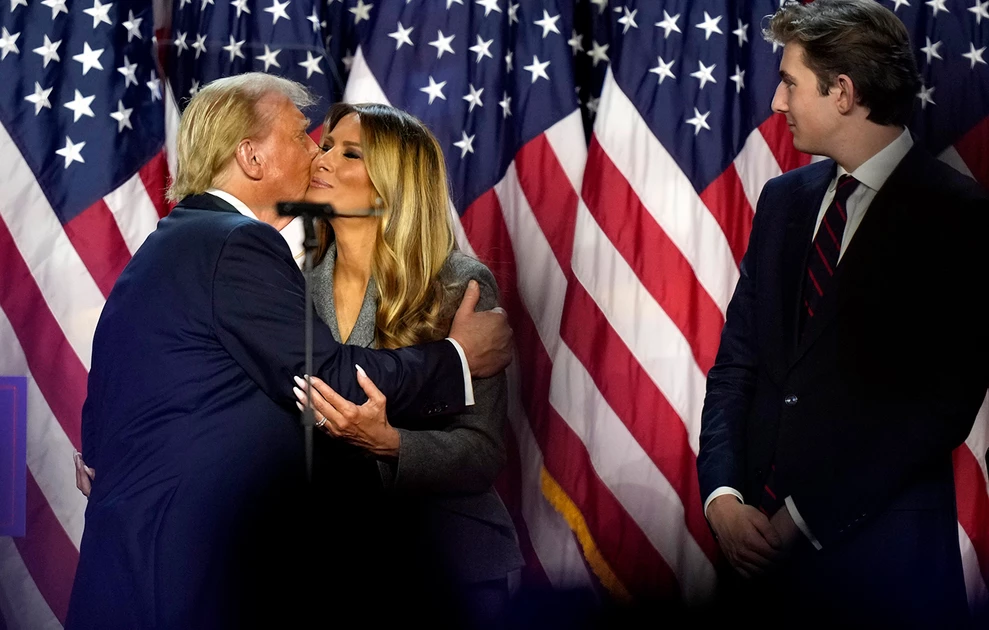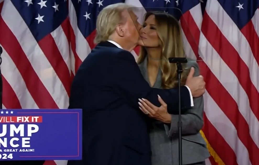 Ο Ντόναλντ Τραμπ, κατά τη διάρκεια της νικητήριας ομιλίας του μετά τη νίκη του στις εκλογές των ΗΠΑ, έδωσε ένα φιλί στο μάγουλο της συζύγου του, Μελάνια.