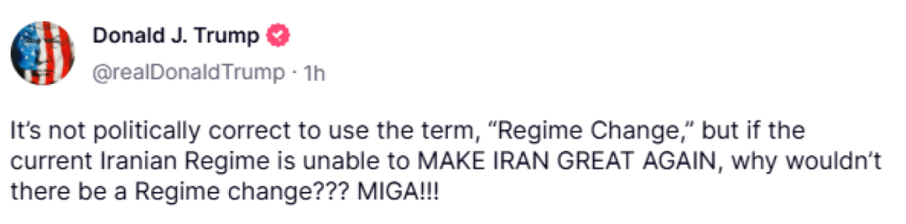 Ειδικότερα, ο Αμερικανός πρόεδρος έγραψε πως «δεν είναι πολιτικά ορθή η χρήση του όρου “αλλαγή καθεστώτος”, αλλά αν το σημερινό ιρανικό καθεστώς είναι ανίκανο ΝΑ ΞΑΝΑΔΩΣΕΙ ΣΤΟ ΙΡΑΝ ΤΟ ΜΕΓΑΛΕΙΟ ΤΟΥ, γιατί να μην υπάρξει αλλαγή καθεστώτος»;