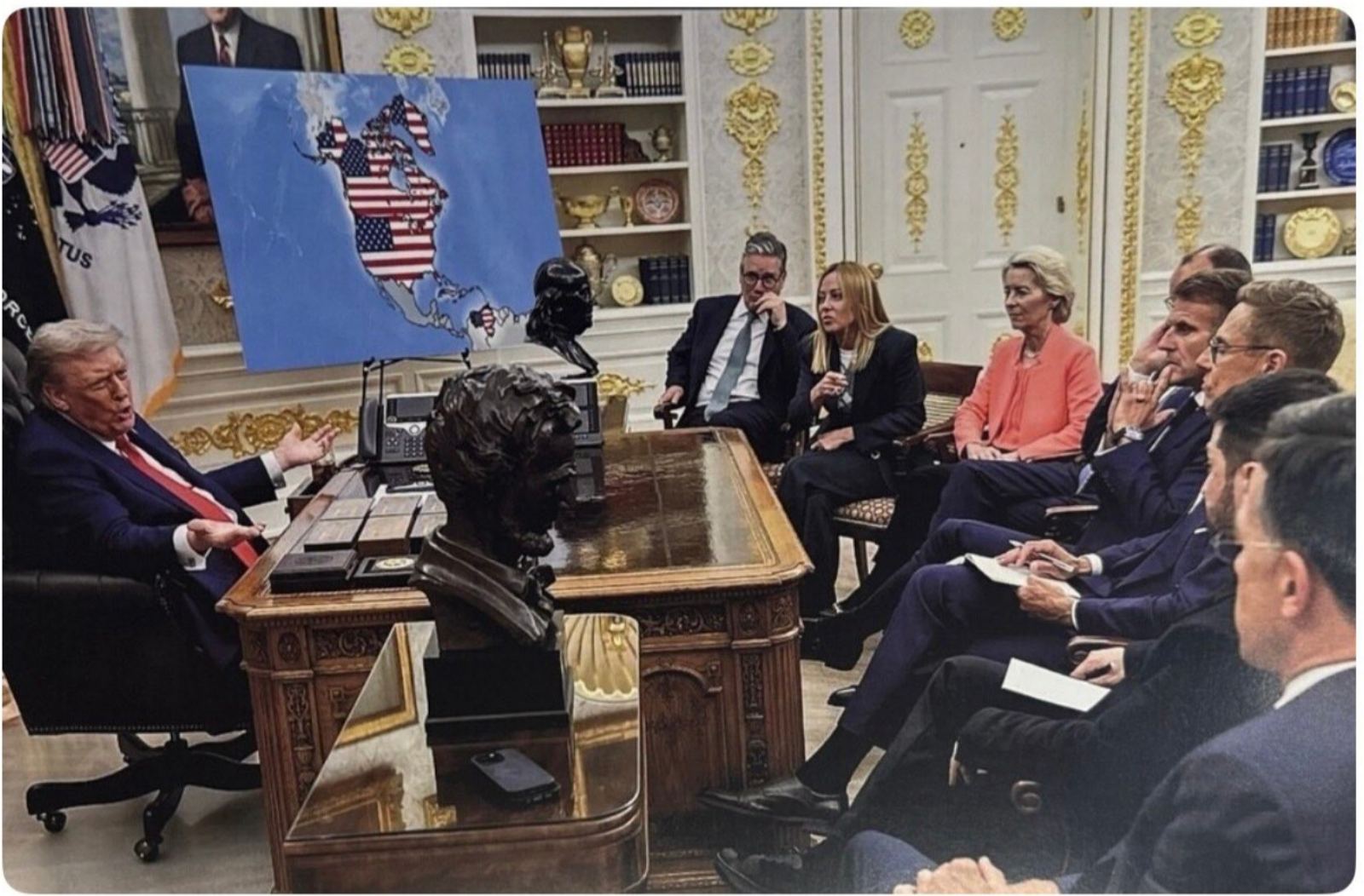 Η δεύτερη εικόνα μεταφέρει τη σκηνή στο Οβάλ Γραφείο, όπου ο Τραμπ απεικονίζεται μαζί με Ευρωπαίους ηγέτες, μεταξύ αυτών ο Εμανουέλ Μακρόν, ο Κιρ Στάρμερ, η Τζόρτζια Μελόνι, ο Φρίντριχ Μερτς και ο Βολοντίμιρ Ζελένσκι, καθώς και ο γενικός γραμματέας του ΝΑΤΟ Μαρκ Ρούτε και η πρόεδρος της Κομισιόν Ούρσουλα φον ντερ Λάιεν.