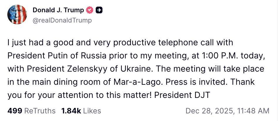 Η ανάρτηση του προέδρου αναφέρει: «Μόλις είχα μια καλή και πολύ παραγωγική τηλεφωνική συνομιλία με τον πρόεδρο Πούτιν πριν από τη συνάντησή μου, σήμερα στις 13:00 [20:00 ώρα Ελλάδος], με τον πρόεδρο Ζελένσκι της Ουκρανίας. Η συνάντηση θα πραγματοποιηθεί στην κεντρική τραπεζαρία του Μαρ-α-Λάγκο.