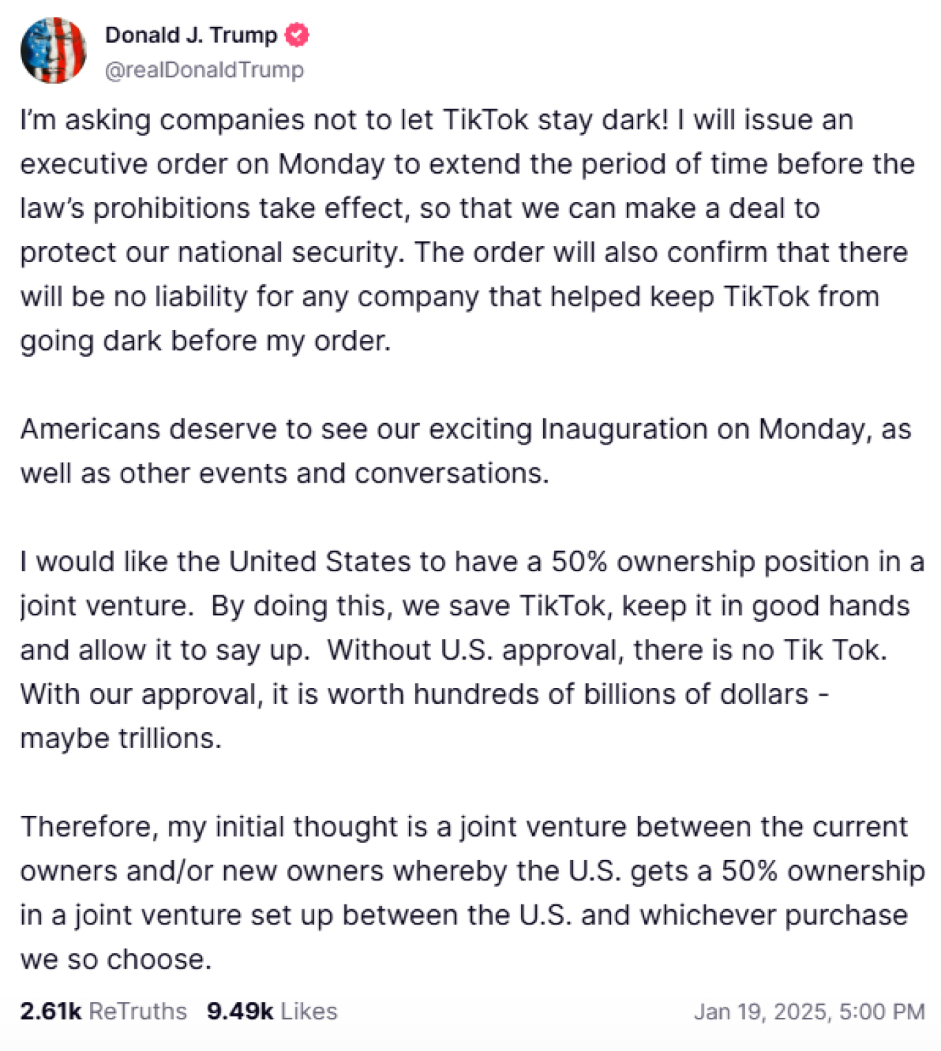 «Ζητώ από τις εταιρείες να μην αφήσουν το TikTok να κλείσει! Θα εκδώσω εκτελεστικό διάταγμα τη Δευτέρα για να παρατείνω το χρονικό διάστημα πριν τεθούν σε ισχύ οι απαγορεύσεις του νόμου, ώστε να μπορέσουμε να κάνουμε μια συμφωνία για την προστασία της εθνικής μας ασφάλειας. Η εντολή θα διασφαλίσει επίσης ότι δεν θα υπάρξει καμία ευθύνη για οποιαδήποτε εταιρεία βοήθησε να αποτραπεί το κλείσιμο του TikTok πριν από την εντολή μου», έγραψε ο Τραμπ στο Truth Social.