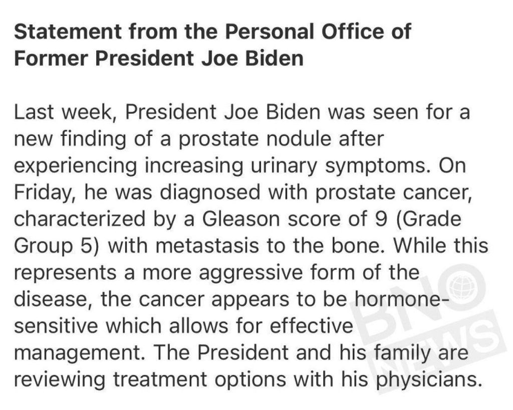 Την Παρασκευή, διαγνώστηκε με καρκίνο του προστάτη, που χαρακτηρίζεται από βαθμολογία Gleason 9 (Grade Group 5) με μετάσταση στα οστά.