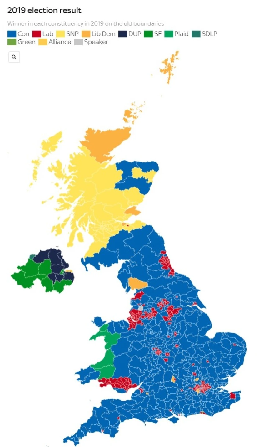 Ο αναλυτής του Sky News Σαμ Κόουτς λέει ότι από την τελευταία αναμέτρηση, αυτή του 2019, ο εκλογικός χάρτης έχει αλλάξει σημαντικά. Οι Τόρις κυριαρχούσαν στην Αγγλία και την Ουαλία και το SNP στη Σκωτία. Οι νικητές Συντηρητικοί είχαν 365 έδρες και οι Εργατικοί 203.