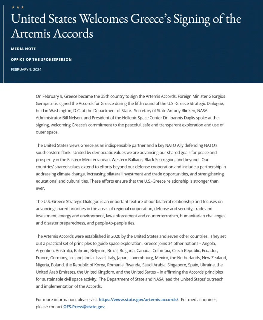 Σε ανακοίνωσή του το Στέιτ Ντιπάρτμεντ τονίζει πως «η Ελλάδα έγινε η 35η χώρα που υπέγραψε τις Συμφωνίες Άρτεμις» και πως «οι ΗΠΑ θεωρούν την Ελλάδα απαραίτητο εταίρο και βασικό σύμμαχο στο ΝΑΤΟ,