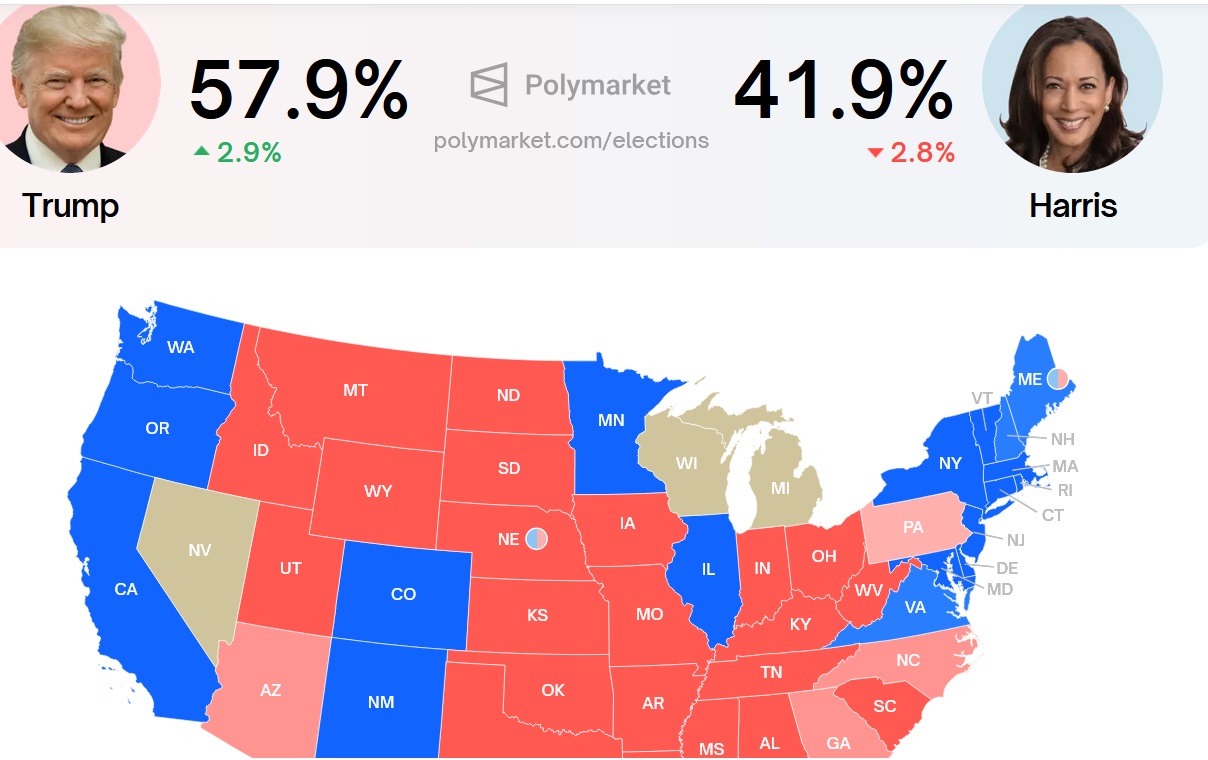 Όπως φαίνεται στο σχετικό διάγραμμα η Κ.Χάρις απο τον ?Ιούλιο όταν ανακοινώθηκε η παραίτηση Biden απο τις προεδρικές εκλογές ξεκίνησε μια ανοδική πορεία στις προβλέψεις για τον τελικό νικητή των εκλογών και μετά τον Αύγουστο έφτασε τον Trump και για αρκετό καιρό τον ξεπερνούσε.