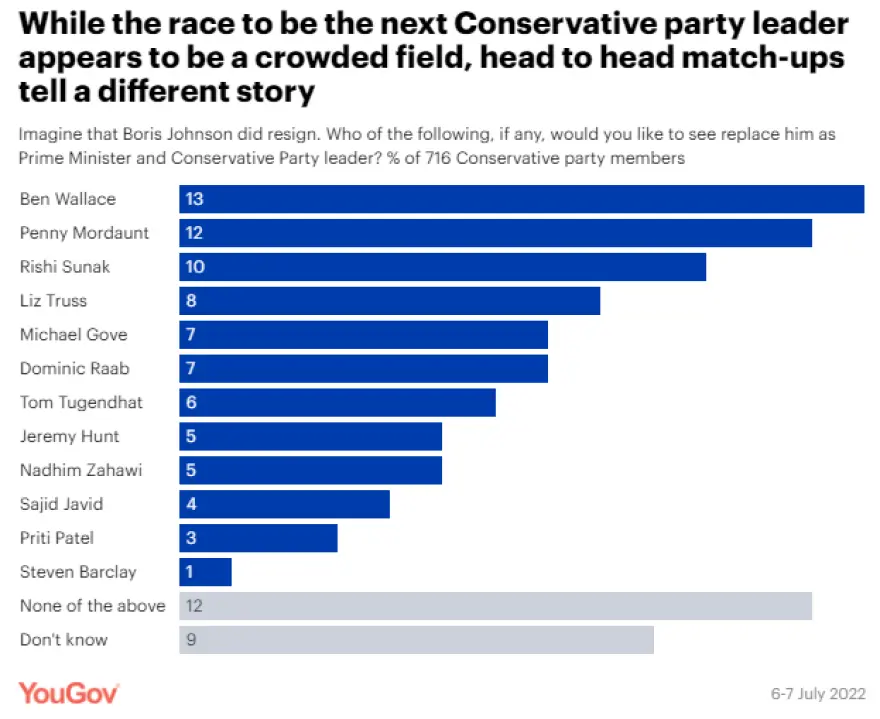 Στη δημοσκόπηση του YouGov, που διεξήχθη σε δείγμα 716 μελών του Συντηρητικού κόμματος, ο Μπεν Γουάλας αποσπά ποσοστό 13%, ενώ σε απόσταση αναπνοής τον ακολουθεί η πρώην υπουργός Άμυνας, Πένι Μόρντοντ (ποσοστό 12%).