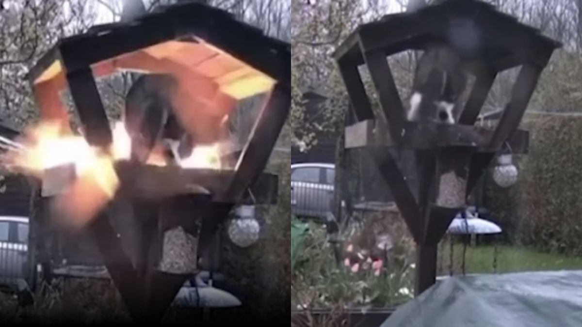 Στα πλάνα φαίνεται η γάτα Suki να πλησιάζει μια κατασκευή πουλιών, όταν ξαφνικά σημειώνεται έκρηξη.