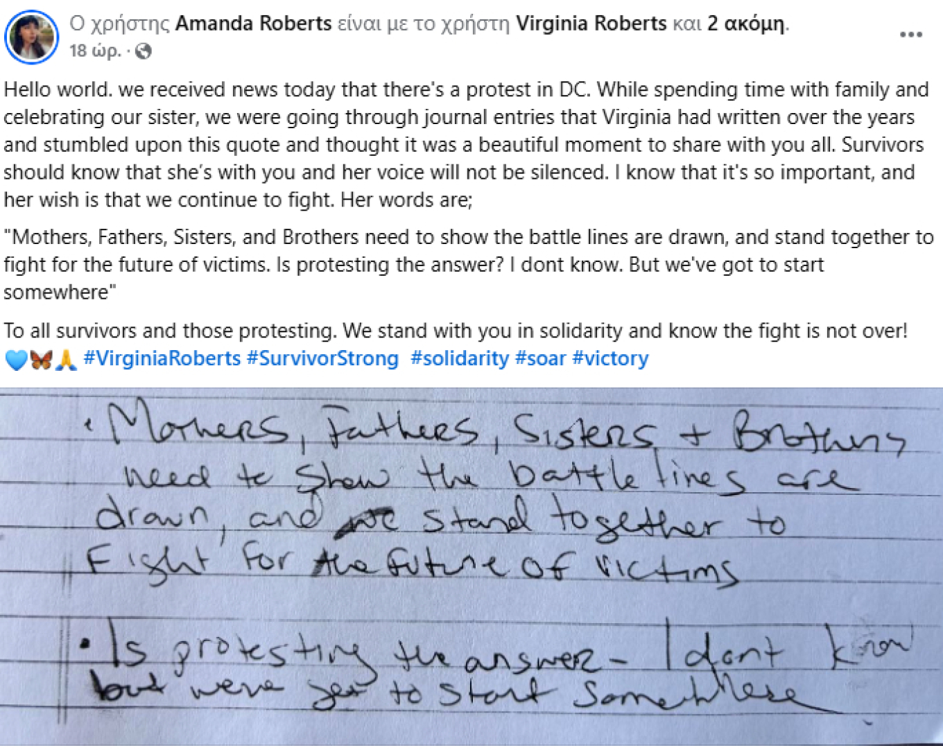 «Γεια σου, κόσμε. Βρήκαμε ένα χειρόγραφο σημείωμα που είχε γράψει η αδελφή μας, η Βιρτζίνια», έγραψε σε ανάρτησή της στο Facebook.