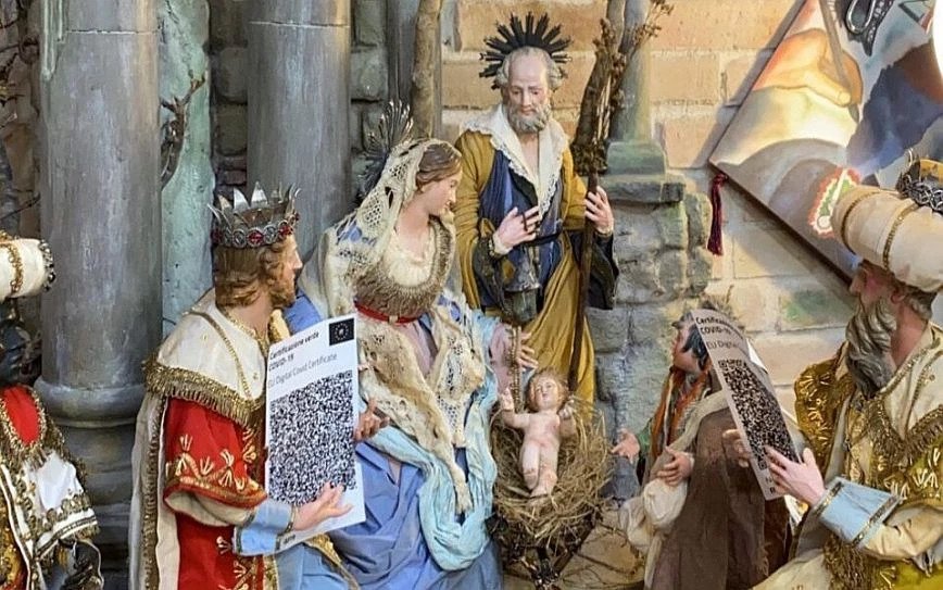 Οι τεχνίτες που φτιάχνουν μικρά και μεγάλα αγάλματα για τις φάτνες των καθολικών, φέτος «επικαιροποίησαν» τους μάγους που επισκέπτονται τον Ιησού: στο χέρι τους κρατούν πιστοποιητικό εμβολιασμού, με κωδικό QR.