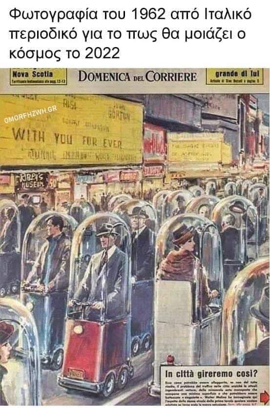 Όπως βλέπετε στην εικονογράφηση αυτή του 1962 απεικονίζονται οι πολίτες του μακρινού για τότε 2020 να μετακινούνται ο καθένας με την προσωπική του… υγειονομική κάψουλα προφανώς για προστασία από κάποιον ιό ή από κάποια μόλυνση που απειλεί την ανθρώπινη υγεία.