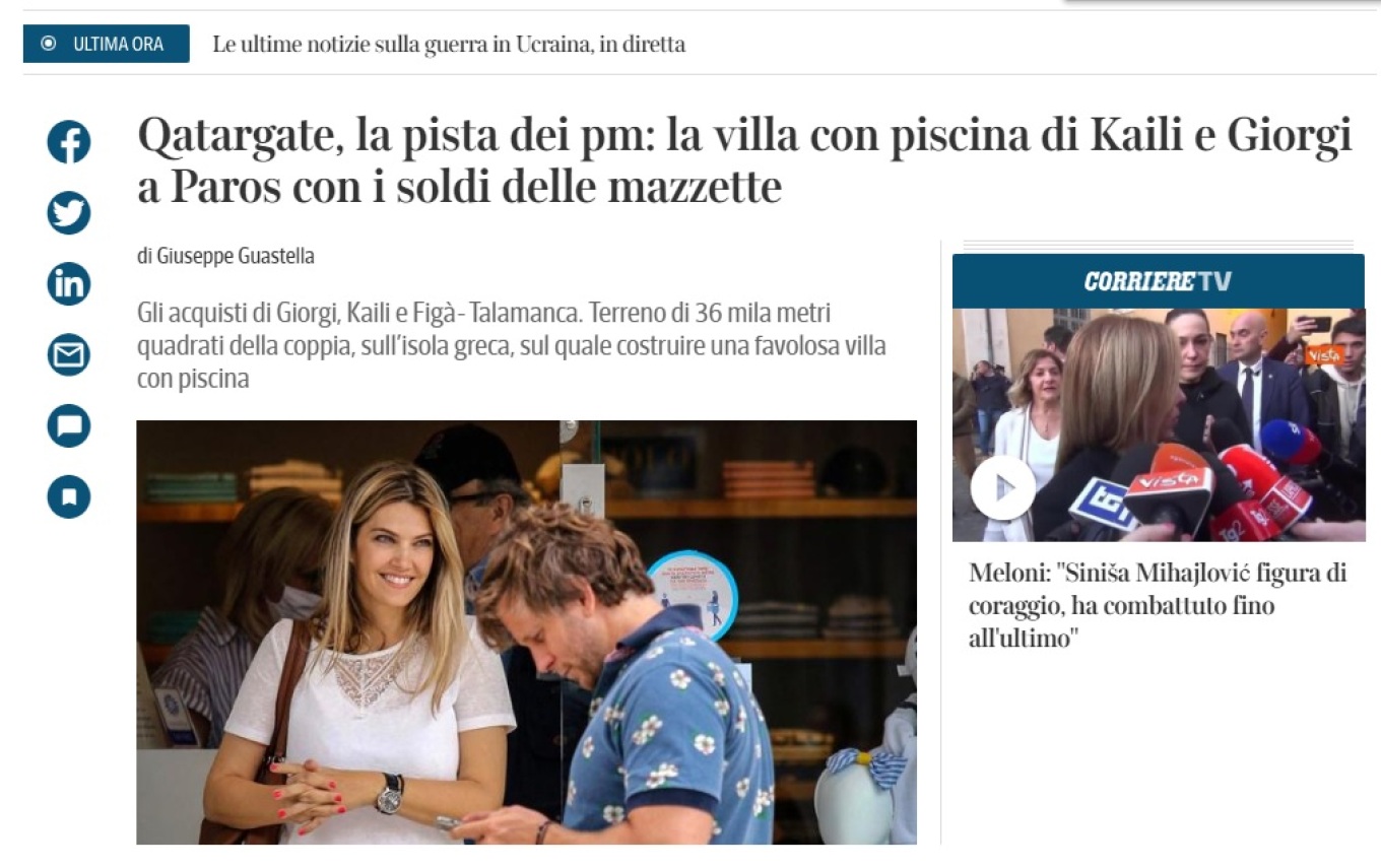 Όπως αναφέρεται στο δημοσίευμα «στις 7 Δεκεμβρίου, δύο ημέρες, δηλαδή, πριν την επιχείρηση που οδήγησε στη σύλληψη τεσσάρων ατόμων για το Qatargate, η Eurojust ζήτησε από ιταλούς εισαγγελείς να διερευνήσουν την αγορά ενός διαμερίσματος στην πόλη Τσερβίνια για την οποία υπήρχαν υποψίες ότι αγοράστηκε με χρήματα από δωροδοκία. Μια κλασσική επιχείρηση “ανακύκλωσης” που θα μπορούσε να κρύβεται πίσω από την επένδυση που έκαναν Καϊλή και Τζιόρτζι για να χτίσουν μια βίλα στο νησί της Πάρου».